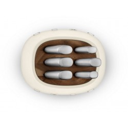 Smeg KBSF02CR è un elegante ceppo coltelli che combina il design iconico della linea 50's Style di Smeg con materiali di prima scelta. Il corpo del ceppo è realizzato in acciaio al carbonio verniciato a polvere color panna lucido, con una base antiscivolo cromata che garantisce stabilità e sicurezza. Al suo interno, un nucleo in legno di acacia ospita 6 coltelli essenziali per la cucina. Le lame e i manici dei coltelli sono forgiati in acciaio inossidabile tedesco di alta qualità, assicurando durata, resistenza alla corrosione e un taglio preciso. Il design ergonomico dei manici offre una presa confortevole per un utilizzo pratico e sicuro.