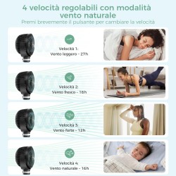 - 4 Velocità di Ventilazione: Tre livelli di potenza costante più una modalità "Natural Wind" che cicla l'intensità per un comfort più naturale.