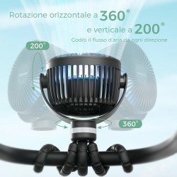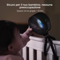 - Treppiede Flessibile Multiuso: Gambe pieghevoli e modellabili che permettono di fissare il ventilatore su passeggini, culle, seggiolini auto o biciclette.