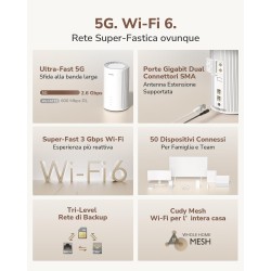 Il Cudy P2 SA/NSA AX3000 è un router 5G di nuova generazione che ti permette di sfruttare appieno la velocità e l'affidabilità delle reti mobili. Progettato per un'installazione semplice e un utilizzo versatile, è la soluzione ideale per chi ha bisogno di una connettività ad alta velocità a casa, in ufficio o in qualsiasi luogo in cui la fibra non arriva.